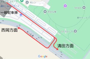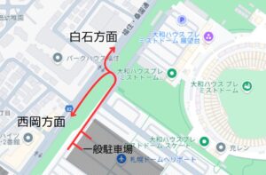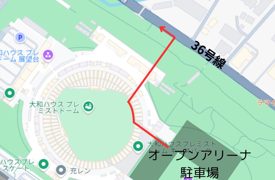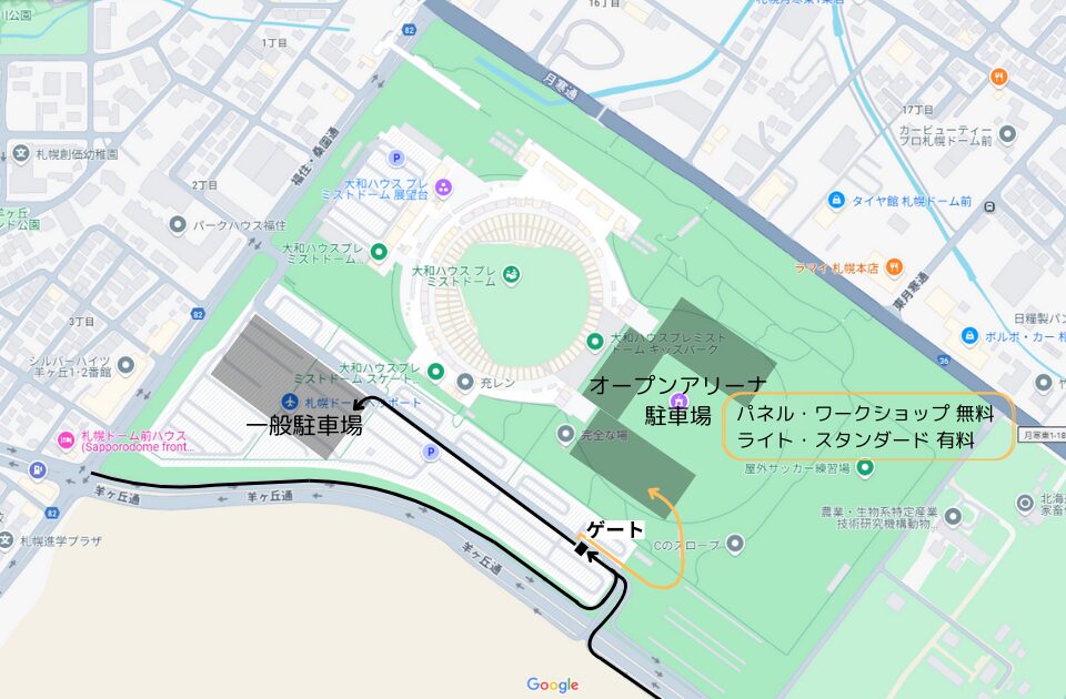 オープンアリーナ駐車場から一旦会場に侵入、フェンスに沿って進み専用通路を通って36号線に出ます。左折(札幌中心部方面)退場のみなのでご注意ください。