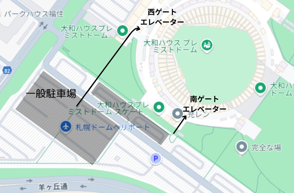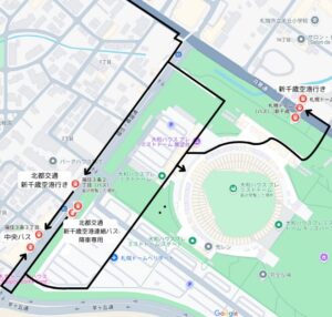 ドーム入場は羊ヶ丘通りからで、下の地図の黒い線が入場経路です。