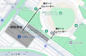 エレベーターは入場口の西ゲートの3機、奥のオープンアリーナ駐車場側の南ゲートの1機を利用できます。