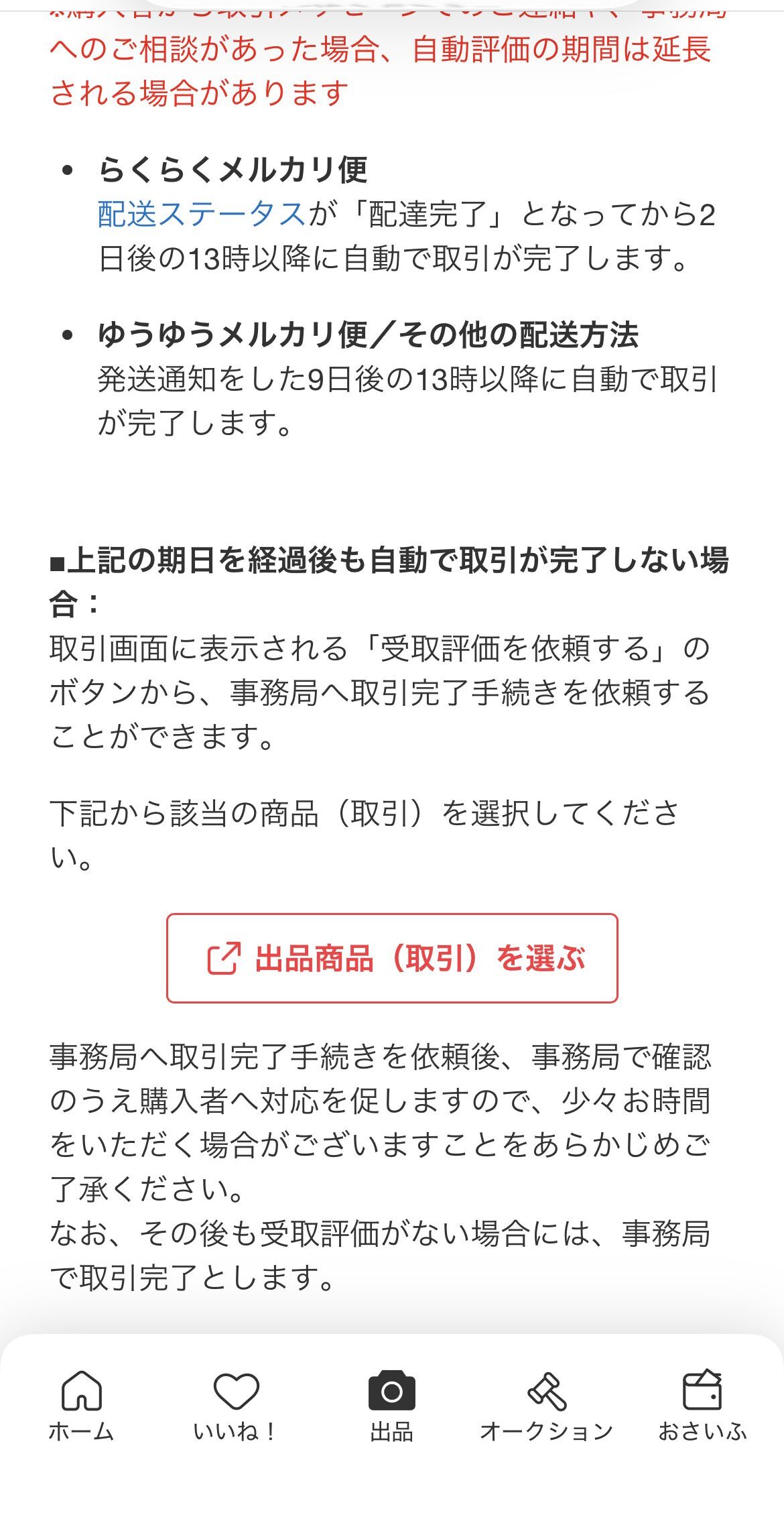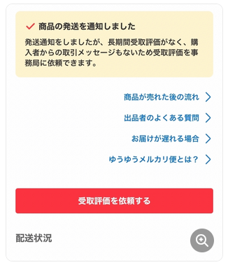 メルカリ事務局に自動で取引を完了してもらうための「受取評価を依頼する」ボタンがあるとのことです。