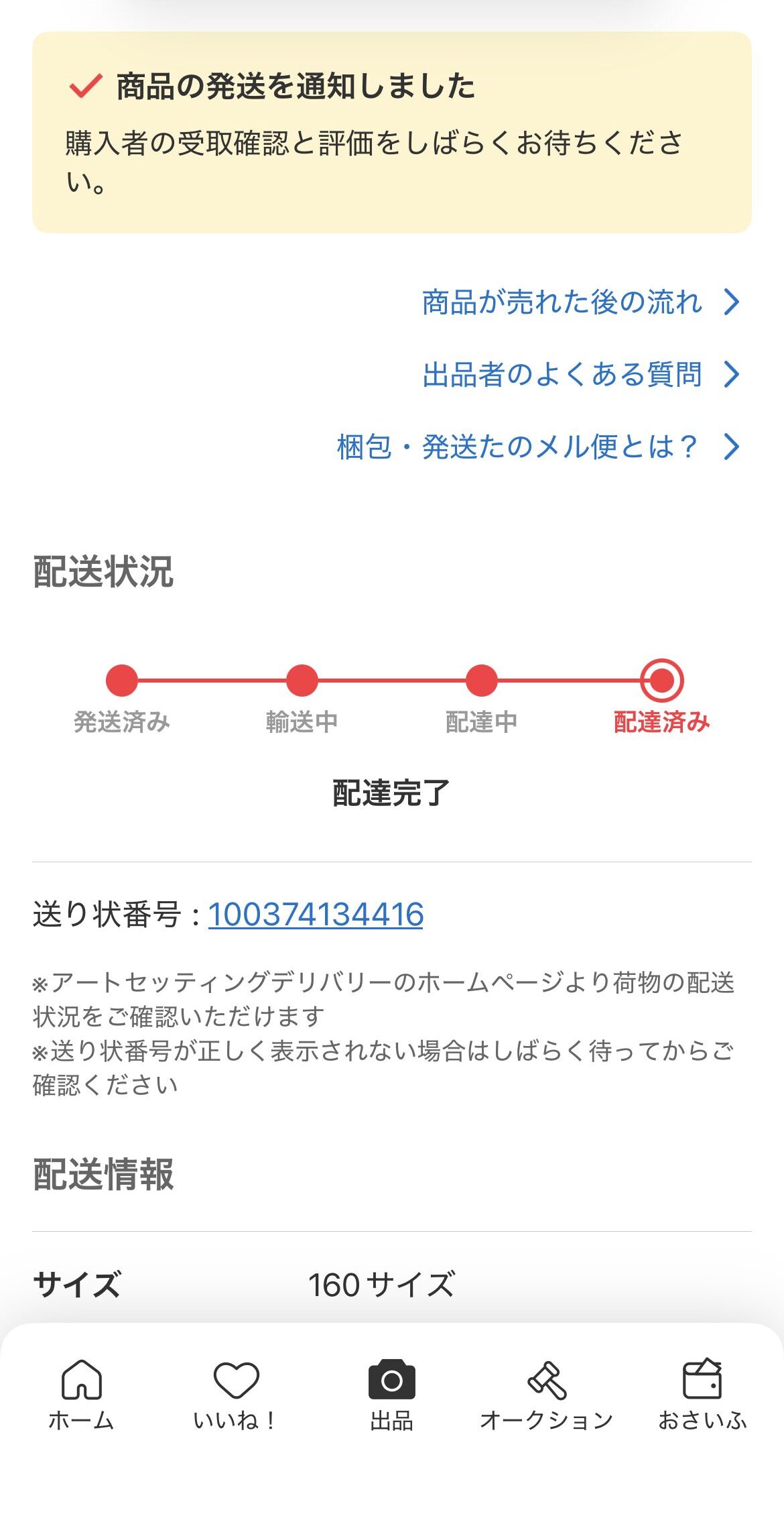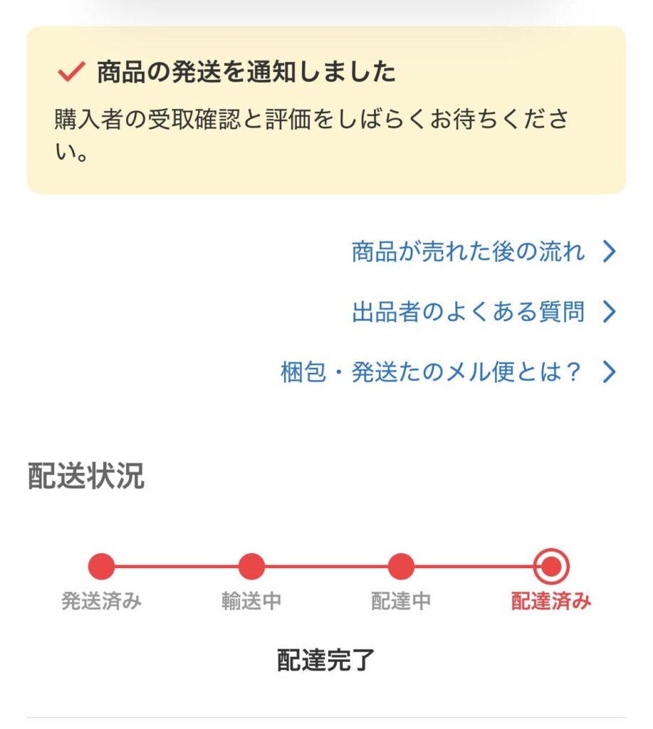 購入者さんが「お届け希望日時」に商品を受け取ったかどうか、メルカリアプリの取引画面で配送状況のステータスを見張りました。